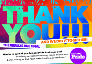 THANKS TO YOU! Campus Pride broke our goal from last year with 286 donors and raising $12,117. Plus ... Read More →