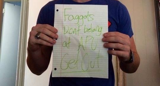 As he put it, “At first, I was very upset when I saw this posted on my front door, but the more I thought about it, the more I realized how much love I’ve received since I came out at APU. This is the first hate mail I’ve ever gotten from anyone at this school, and the best thing about it is that they were too cowardly to even say it to my face. I’m not posting this for people to pity me or apologize on the persons behalf, I’m posting this to show that I’m not ashamed of who I am and I’m proud to stand up for what I believe in. I wholeheartedly respect anyone for having their own opinions against what I believe, but what I can’t respect is when people are too ashamed to even say it to my face. As Christians, we are called to show God’s LOVE in everything we do, and that’s what I plan on doing if this person ever confronts me. To whoever did this: I forgive you and I know God does too. Have a blessed day everyone and don’t ever let the little things get you down!”