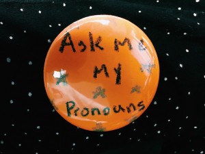 Now that you’ve made your pronoun buttons, it’s time to get people to wear them! Try handing them out at club meetings, conferences, events, parties, in class or wherever people are gathering! You can encourage people to pin their buttons to their jackets or bookbags so people can see them at any point!