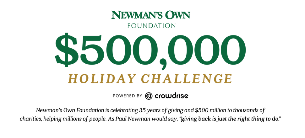 The Newman’s Own Foundation $500k Holiday Challenge launched on CrowdRise on November 21, 2017 at 12pm ET and runs through January 3, 2018 at 1:59:59pm ET. There are 10 grand prizes up for grabs with the team that raises the most online winning $150,000 and 10th place winning $2,500. On #GivingTuesday an additional $85,000 will be awarded to the top 3 charities. Plus, weekly Bonus Challenges enable charities to win up to another $115,000.